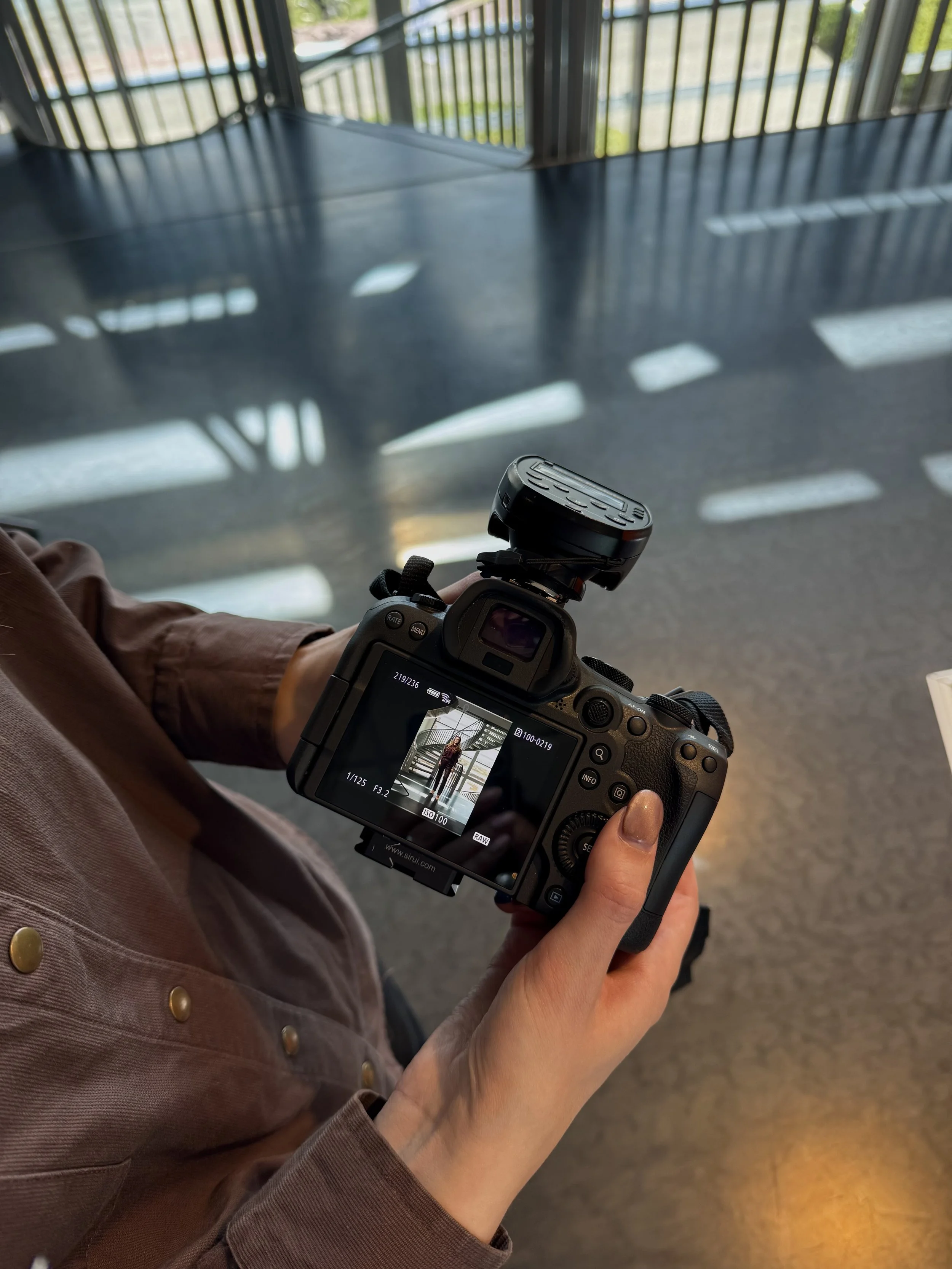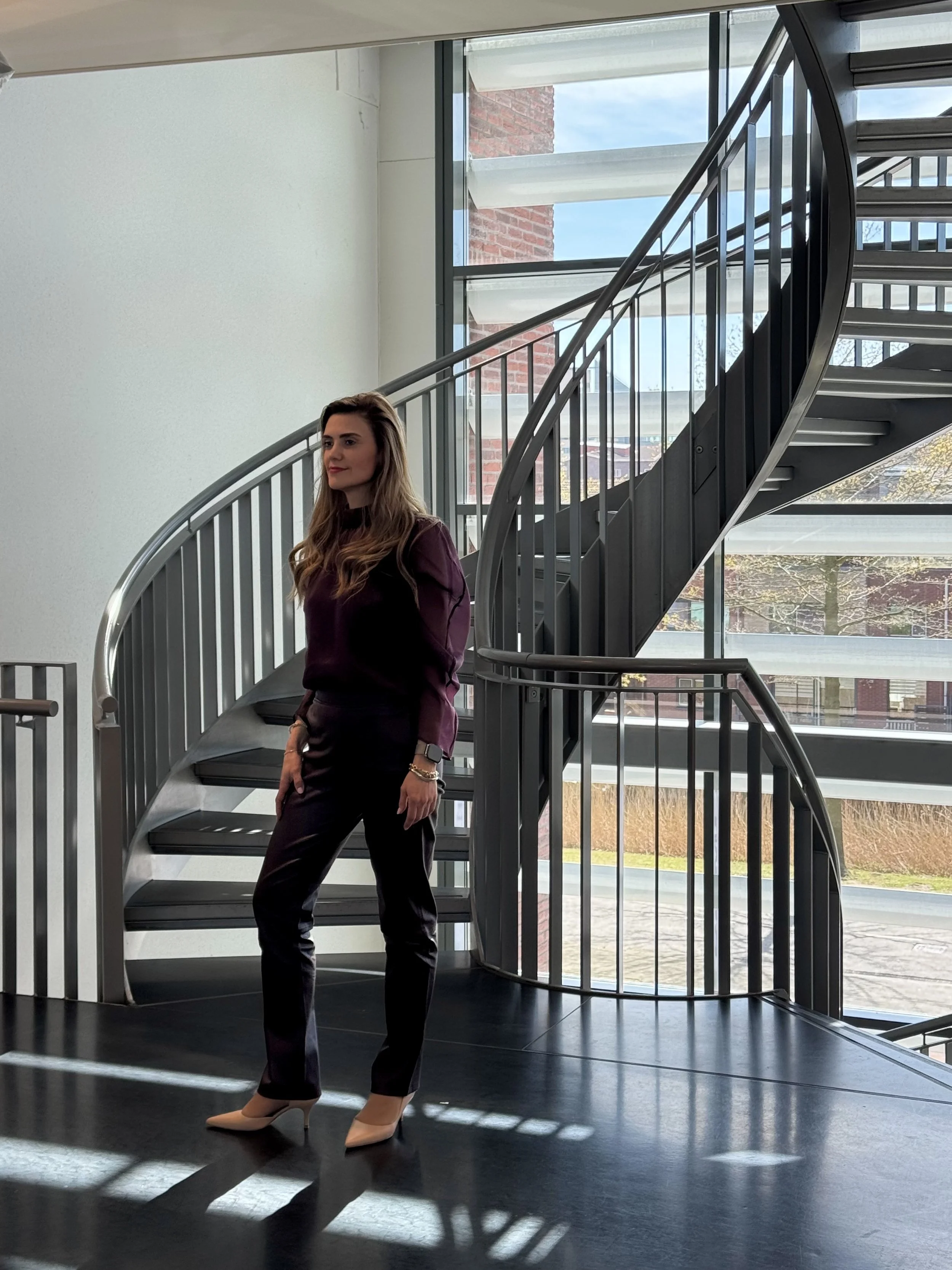 De shoot begon met een kleine zoektocht naar de juiste locatie binnen het gebouw. Gelukkig leidde die zoektocht ons naar een bijzondere plek: een indrukwekkende trap die van boven tot onder doorloopt. Het voelde als het kloppende hart van het pand.