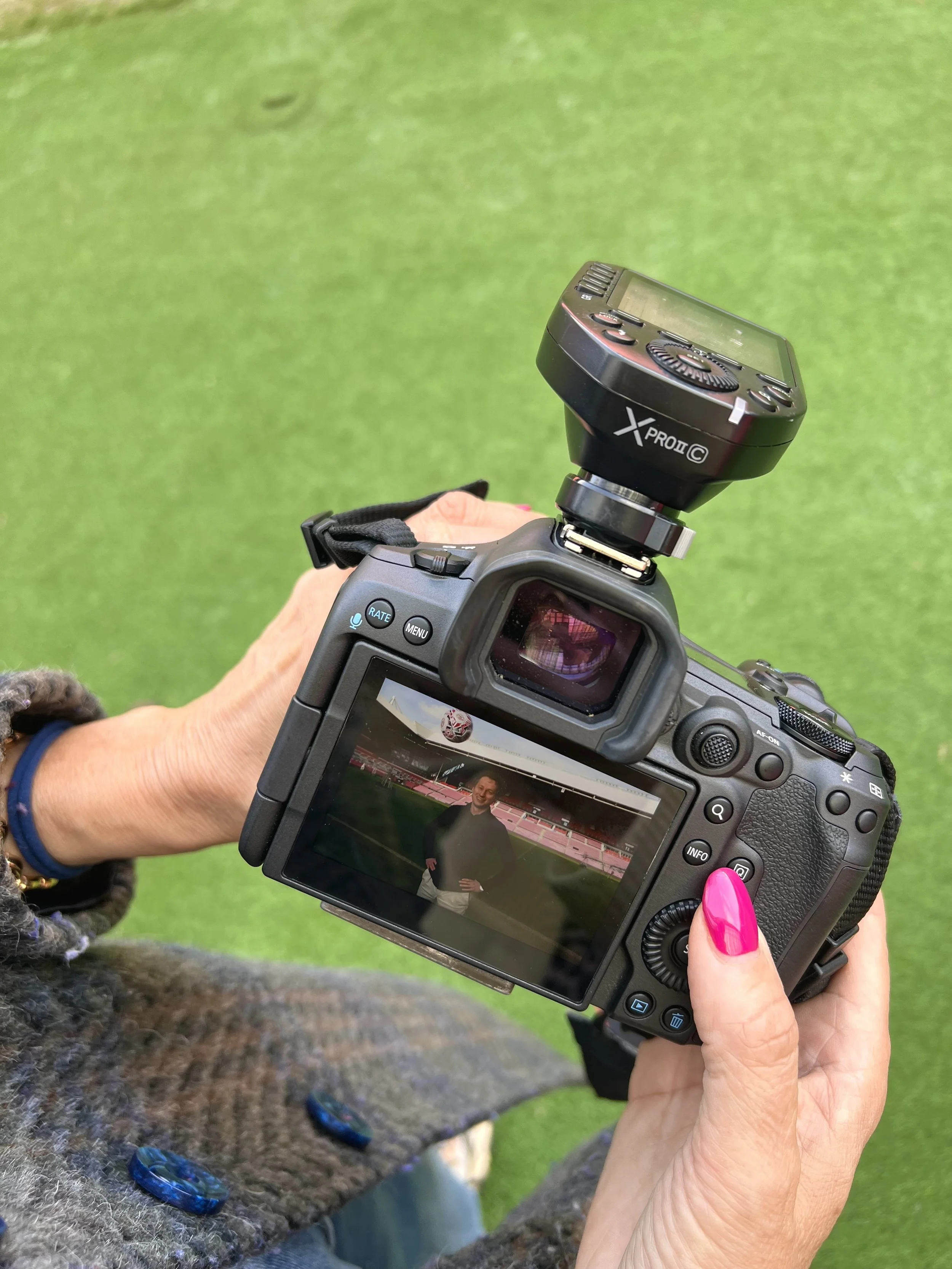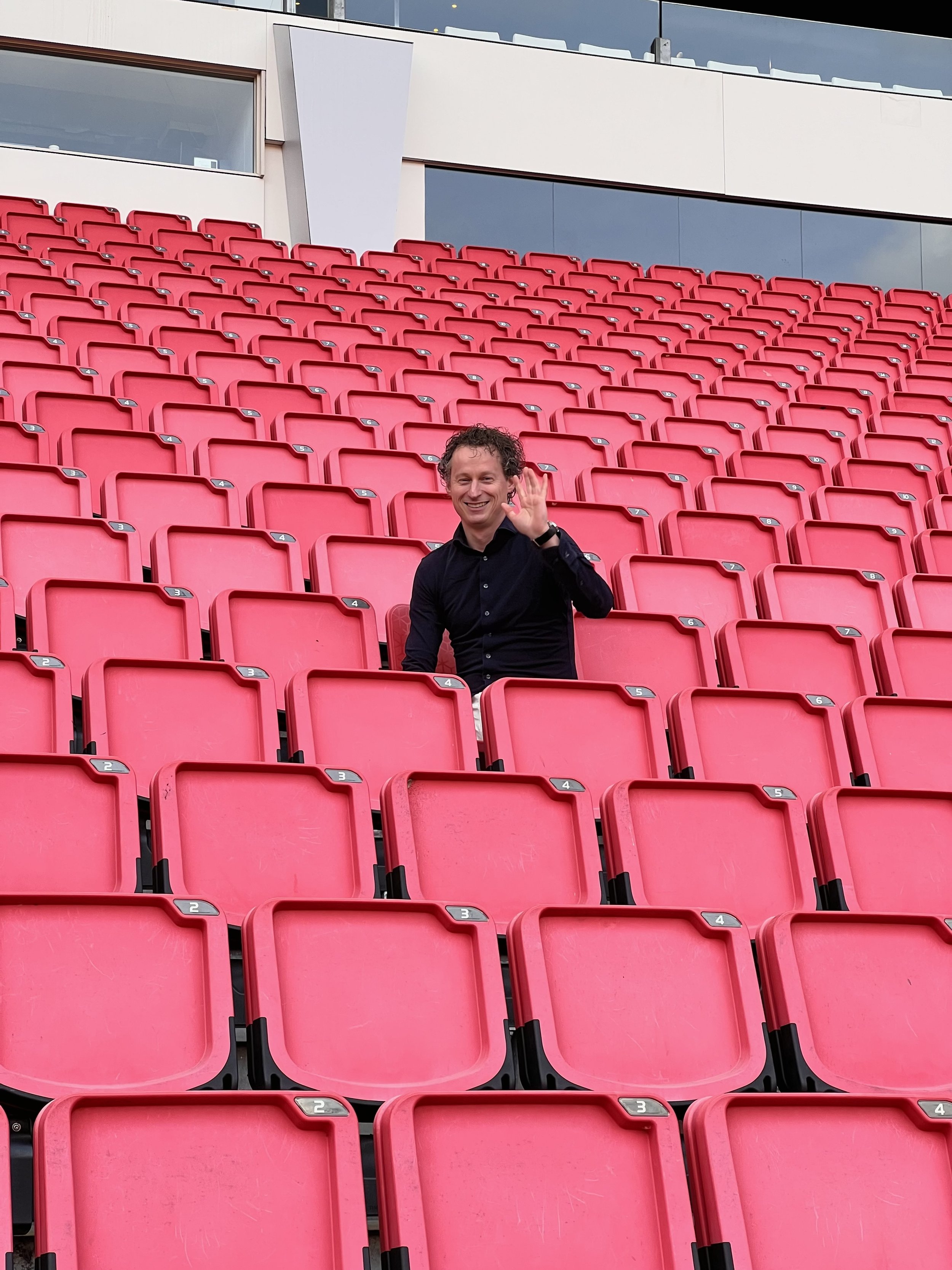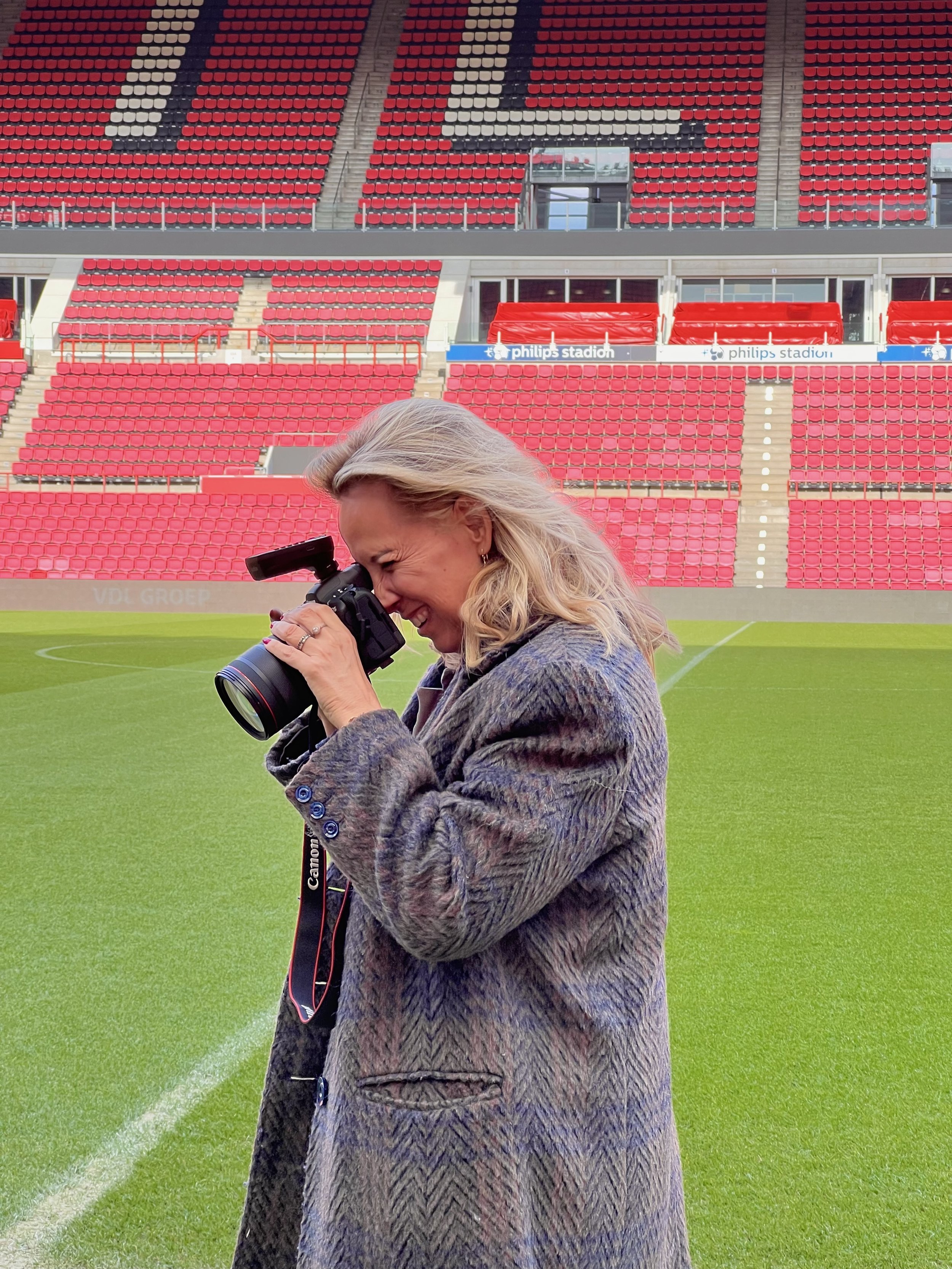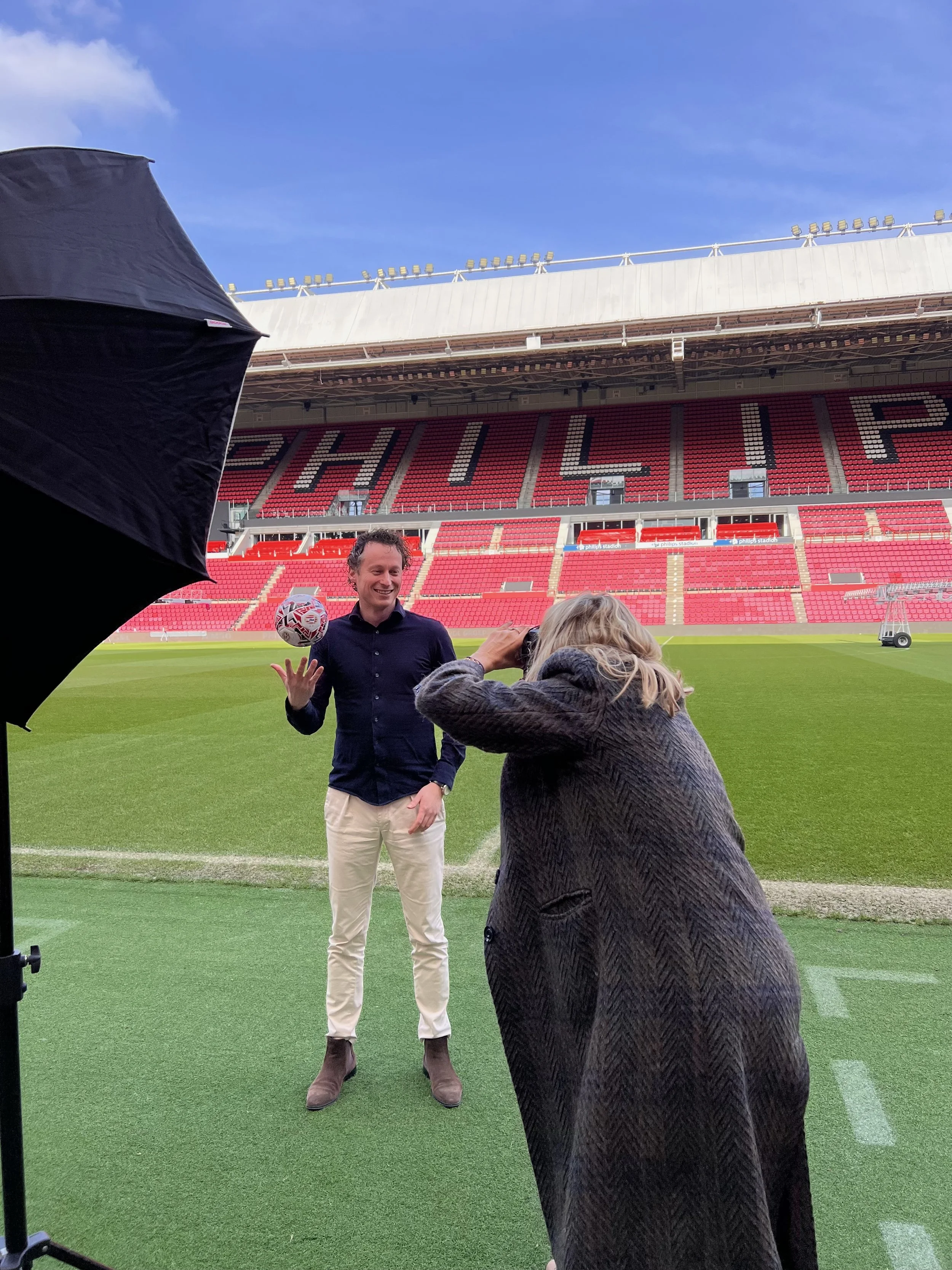 Na een rondleiding door het stadion verkenden we samen de beste plekken voor de shoot. Het contrast tussen de leegte van het stadion en de energie van de locatie gaf direct richting aan het beeld.